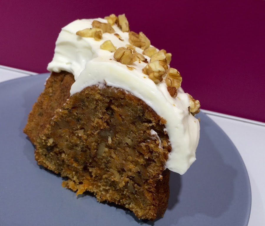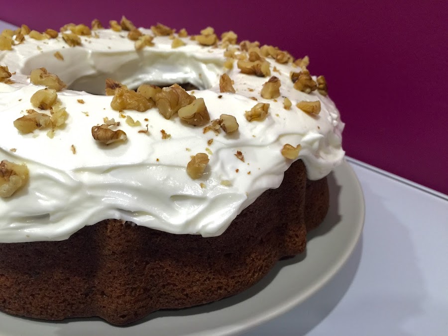 10. Cubrimos toda la superficie del bund cake con el frosting de queso. Ponemos unas nueces picadas por encima para decorar. Ahora si que si, a comer. Si no lo vais a comer al momento recordar que hay que guardarlo en la nevera para que se conserve. En el caso que sobre, también guardarlo en la nevera.