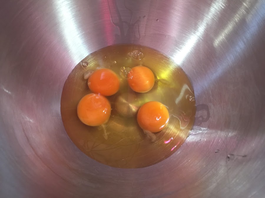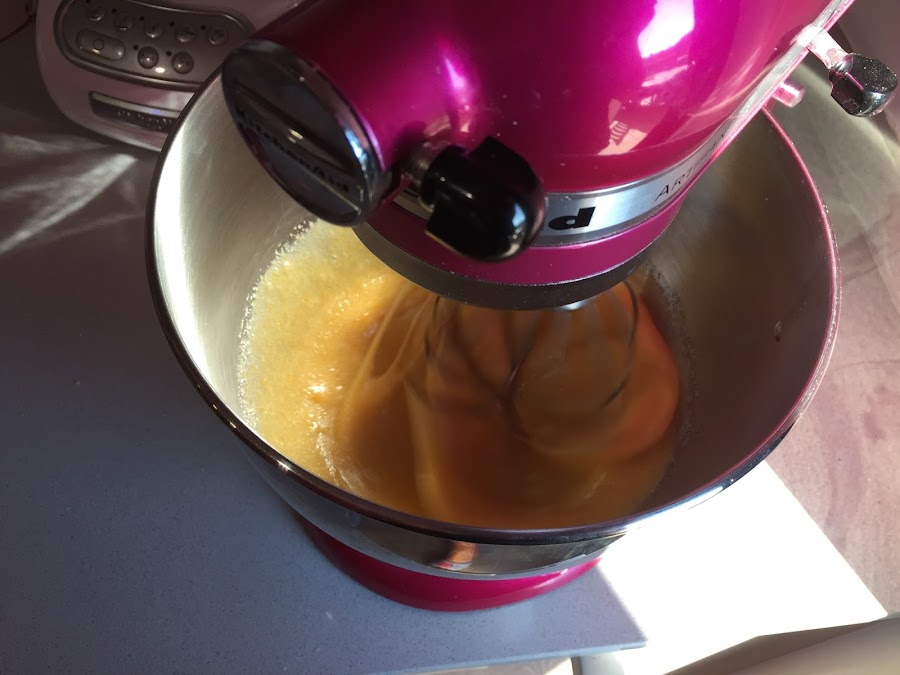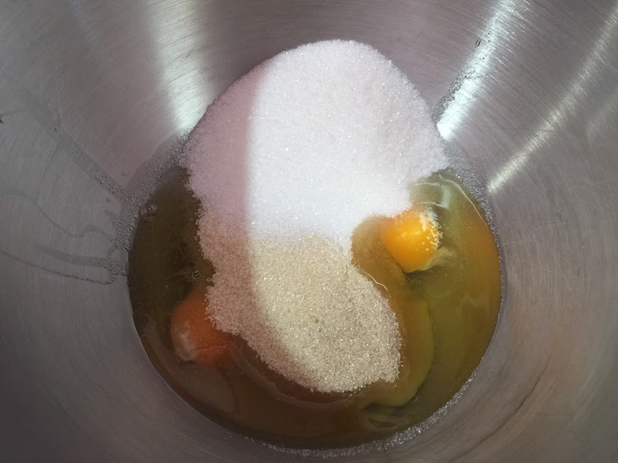 2. En el bol de la KA ponemos el azúcar y los 4 huevos. Batimos hasta que la mezcla quede con burbujitas. No hay que montar los huevos, solo batir hasta que se vea un poco esponjosa.