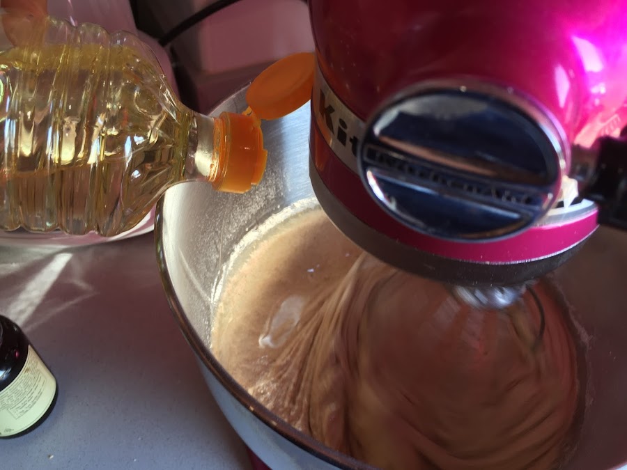 4. Progresivamente añadimos el aceite de girasol a la mezcla, sin dejar de batir mientras se incorpora.