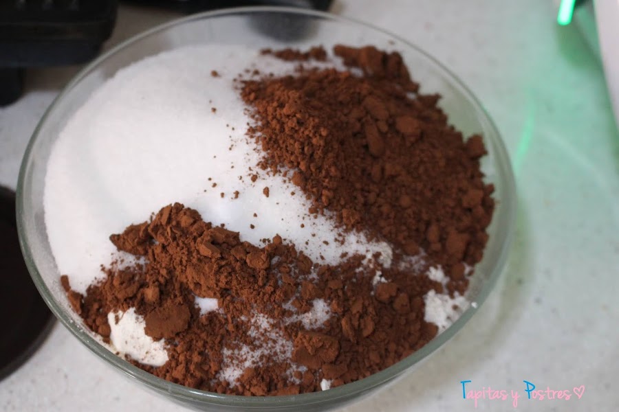 Ahora en un recipiente mezclamos los ingredientes secos: azúcar, harina, sal, bicarbonato y cacao.