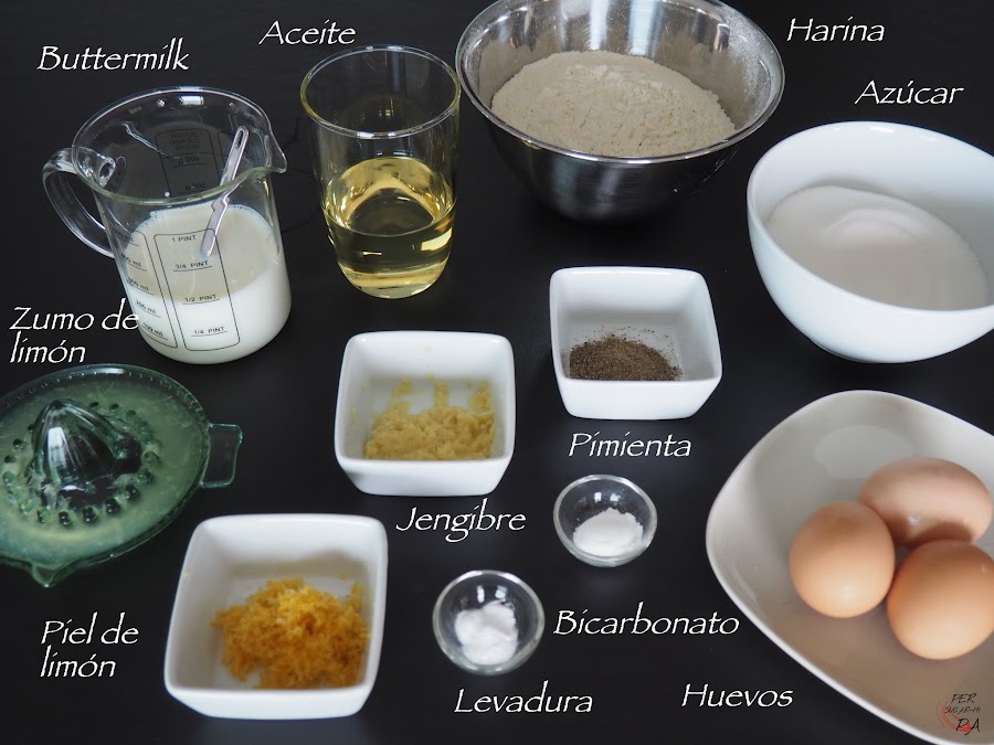 Incorporar, intercalándolos, los ingredientes secos y el buttermilck. Empezar y terminar por los secos en tres veces: harina, butter, harina, butter y harina. Batir bien hasta que esté todo bien mezclado, finalmente añadir la mezcla de limón y jengibre.