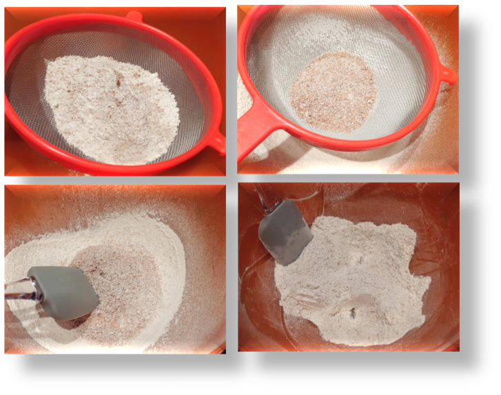 Aparte, en un bol, tamiza las harinas, especias, bicarbonato y sal. En el tamiz quedarán trazas, añádelas a lo que haya colado e integra bien con el resto de ingredientes. Reserva.