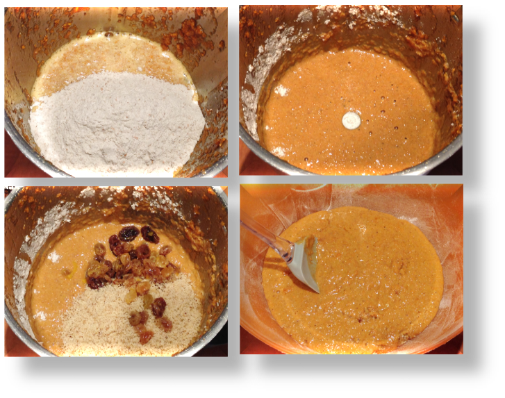 Vierte la masa a un bol y añade por último las nueces y las pasas (sin zumo) que habías reservado.