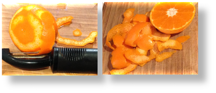 Con ayuda de un cortador de patatas, retira la piel de la mandarina evitando llevarte la parte blanca. Reserva.