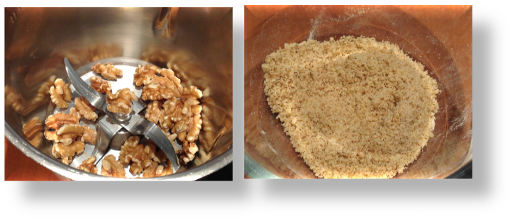 Añade al vaso del Thermomix las nueces peladas. Pon la tapa y el cubilete, y cierra el vaso. PROG. / 5 SEG. / VEL. 6. Vierte en un bol y reserva.