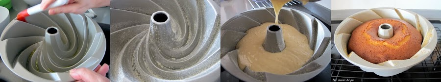 Untar el interior del molde con un poco de aceite o mantequilla. Espolvorear con pan rallado de manera que quede una fina capa adherida a las paredes. Verter la preparación en el molde y honear a 180º durante una hora aproximadamente, vigilando la evolución en los últimos 15 minutos para que no se nos queme. Ya sabéis, cuando se pincha con un palillo y sale limpio está listo.