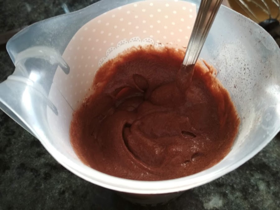 Cuando esté todo mezclado y sea una crema fina y sin grumos se divide en dos, a una mitad se le añade el té matcha, a la otra el cacao y se remueve hasta incorporar.