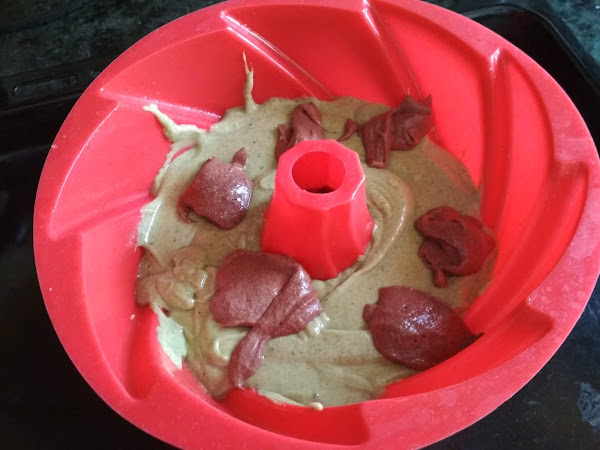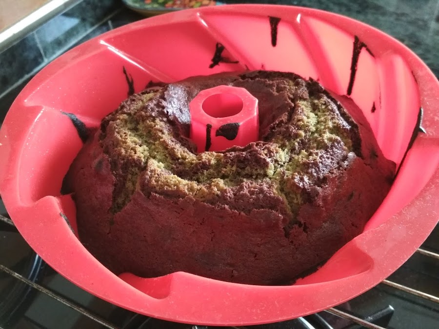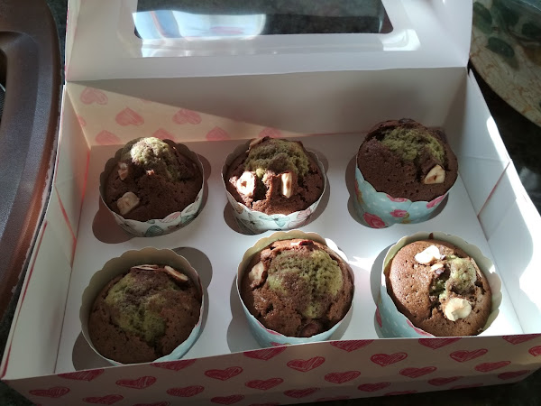 Se pone primero la masa con té y luego la de cacao y con una brocheta se hacen remolinos para que se mezcle. Se mete al horno caliente, yo éste lo tuve 40 minutos a 180 grados pero los minimuffins los tuve 18 m.