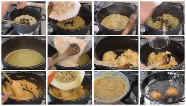 Tenemos que obtener una masa compacta como un puré muy espeso que al coger con la cuchara de dejarlo caer caiga lentamente, si veis que al añadirle el segundo huevo la masa esta muy dura añadirle uno más.