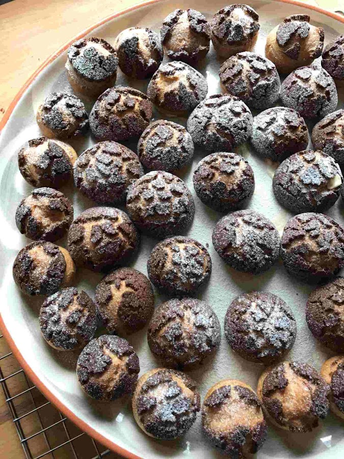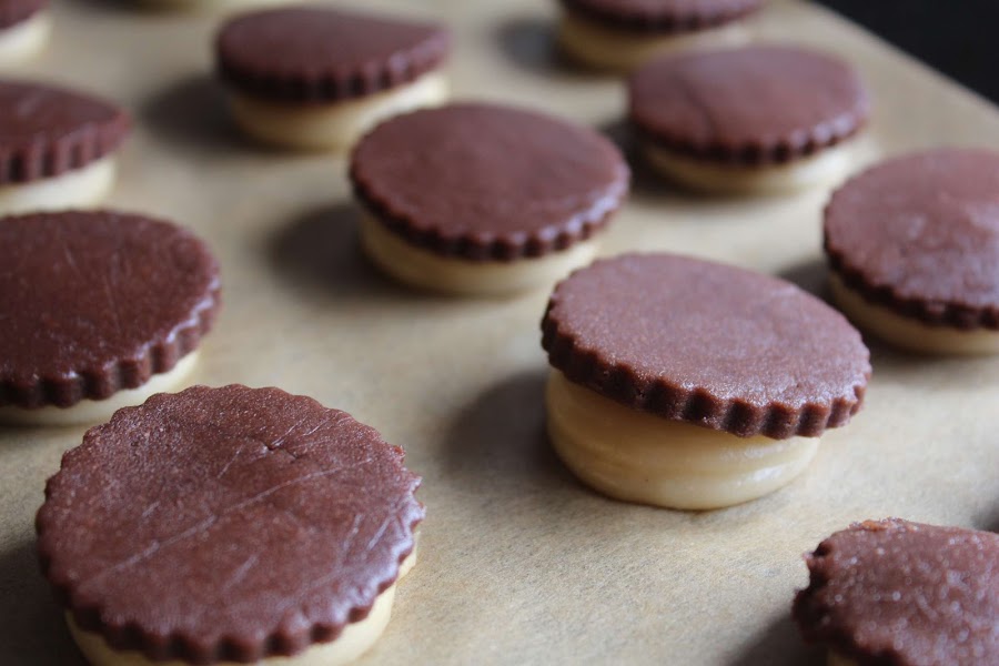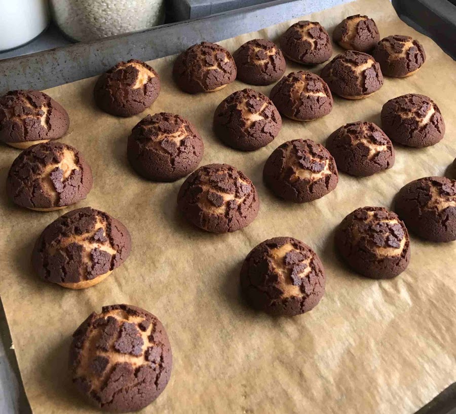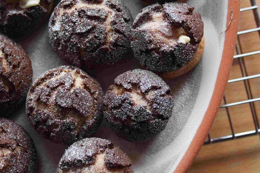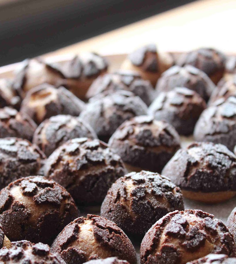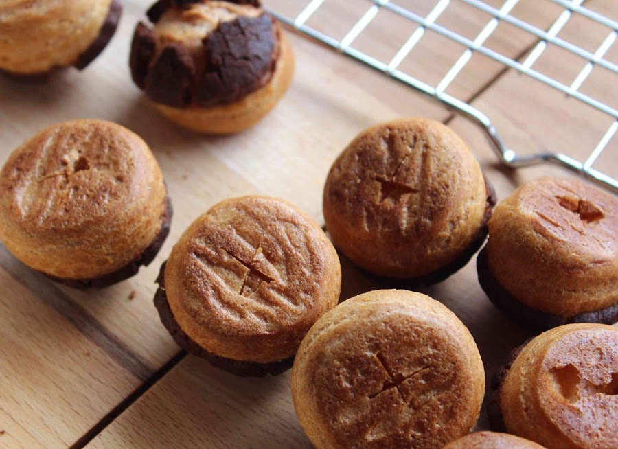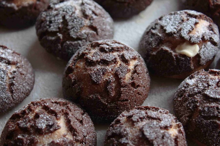 Sacamos la masa del craquelín de chocolate de la nevera, la estiramos y con un cortador redondo que tenga un diámetro un poco mayor que el de los petit choux, vamos cortando círculos y los colocamos encima, apretando un poquito, pero poquito...