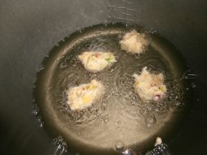 Paso 7. Una vez caliente el aceite y que comience a descontar el tiempo, vamos introduciendo los buñuelos en la cubeta hasta dorar. Al extraer, secar en papel absorbente y servir calientes.