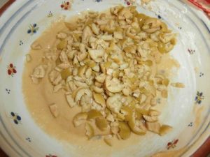 Paso 2. Escurrimos las aceitunas, deshuesamos. Estas aceitunas se deshuesan muy bien ya que vienen partidas y troceamos. Añadimos a la pasta.