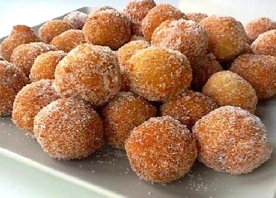 En un tazón mezcle la leche,huevos,azúcar,vainilla,mantequilla derretida,en la harina colocar el polvo de hornear,canela y sal agregar al tazón mezcle bien,colocar la mezcla con una cuchara en el aceite caliente dejar dorar,hacer una o dos depende tamaño de la olla para que no se peguen al freír, ya listos colocar en papel toalla para eliminar exceso de grasa,pasar los buñuelos calientes por el azúcar y servir de inmediato.