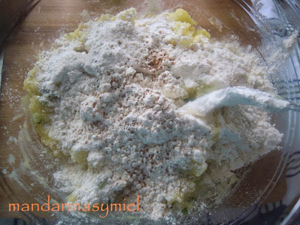 Una vez está todo bien unido, añade la harina, la sal, la pimienta y la nuez moscada.