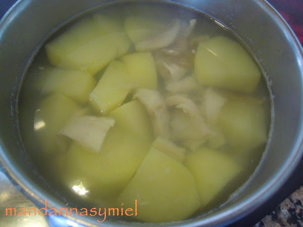 Pela las patatas y trocéalas, ponlas a cocer en agua con sal. Cuando estén a media cocción, les añades el bacalao medio deshecho, en trocitos. Esto no lo dice la señora Marquesa, pero yo siempre que hago buñuelos o albóndigas de bacalao, se lo añado a las patatas y así cogen más sabor, pero pon el bacalao casi al final. Como he puesto el bacalao inglés cortado ya, no he tenido que cortarlo con un machete como dice la Marquesa....