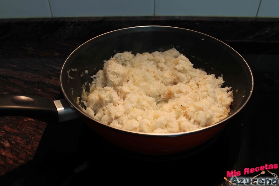 Pasados los 3 minutos añadiremos el bacalao desmenuzado, removemos todo y lo dejamos 3 minutos más.