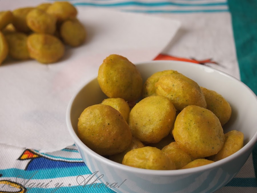 Ponemos a calentar a fuego no muy fuerte abundante aceite. Con la ayuda de una cucharada sopera cogemos la masa y la introducimos en la sartén con el aceite caliente, la masa se mantendrá a flote y le daremos la vuelta para que se dore por todos los lados.