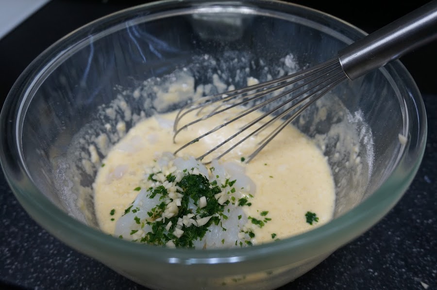 Echamos un par de cucharadas de harina, la levadura, los ajos el perejil y el bacalao, lo mezclamos.