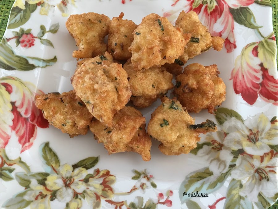 6. Colocamos aceite en un cazo y vamos friendo la masa de los buñuelos que cogeremos con una cuchara. controlar el aceite que no este muy caliente.