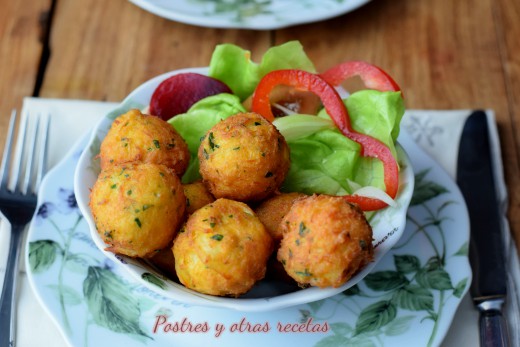 Cogemos porciones de la preparación anterior y con las manos vamos formando bolitas. Las freímos en abundante aceite bien caliente hasta que se hinchen ligeramente y luego les damos la vuelta.