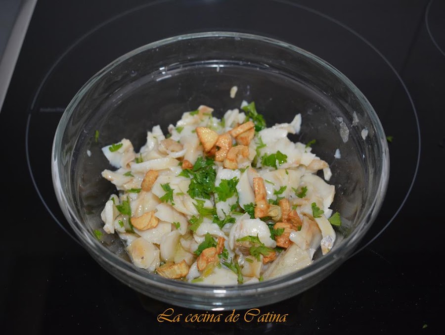Ponemos a calentar aceite en una sartén, cuando esté caliente, echamos el ajo laminado para que se dore y cuando veamos que las láminas se doran, vertemos el aceite y las láminas de ajo sobre el bacalao que tenemos reservado.