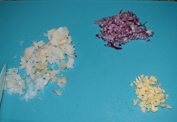 A continuación cortamos la cebolla y los ajos, también a trozos pequeños.