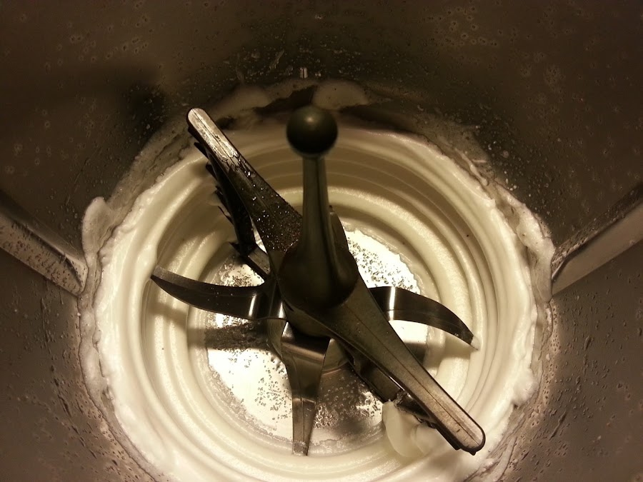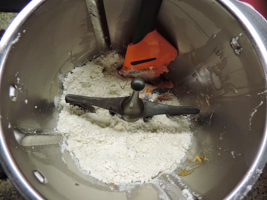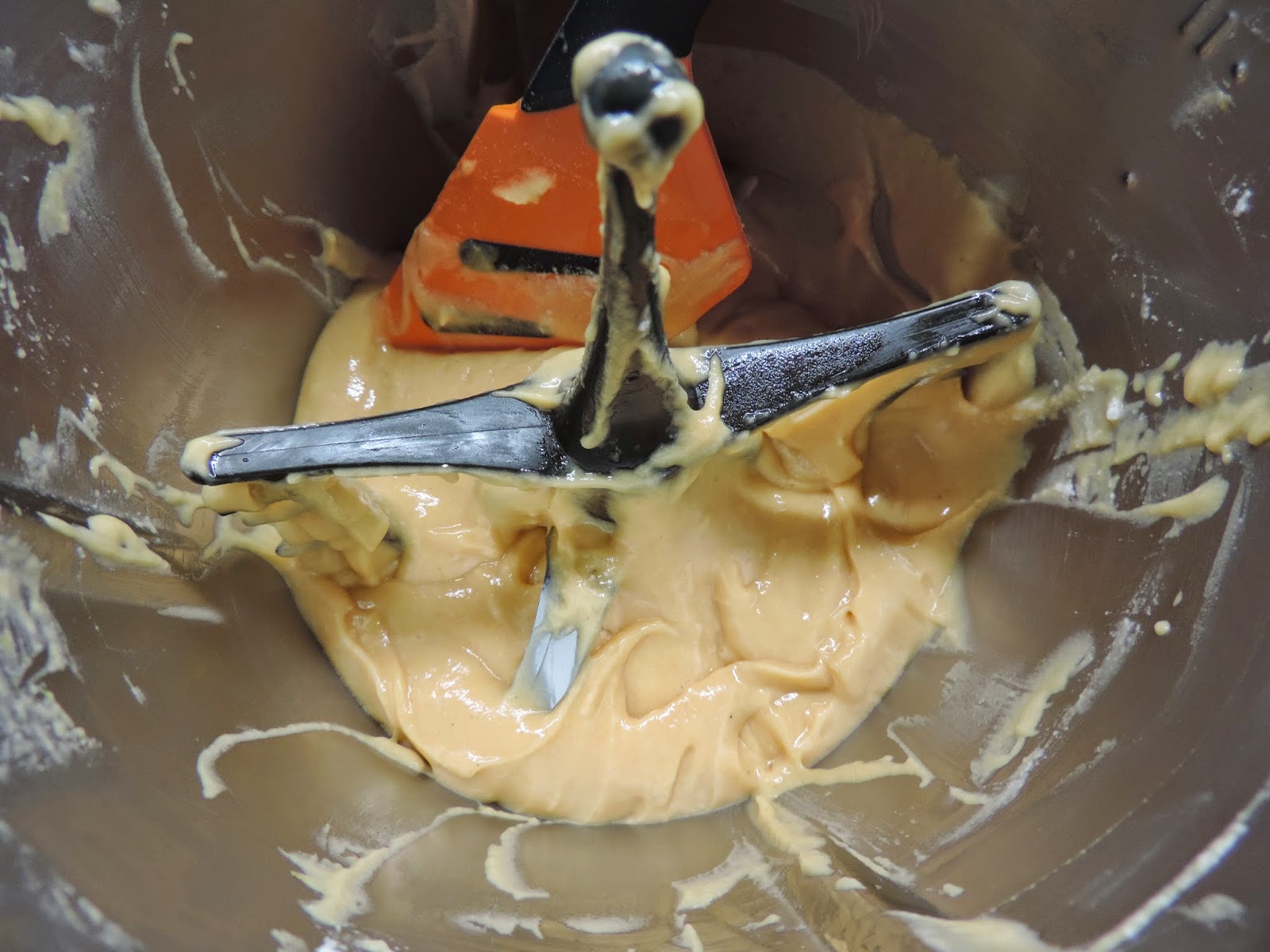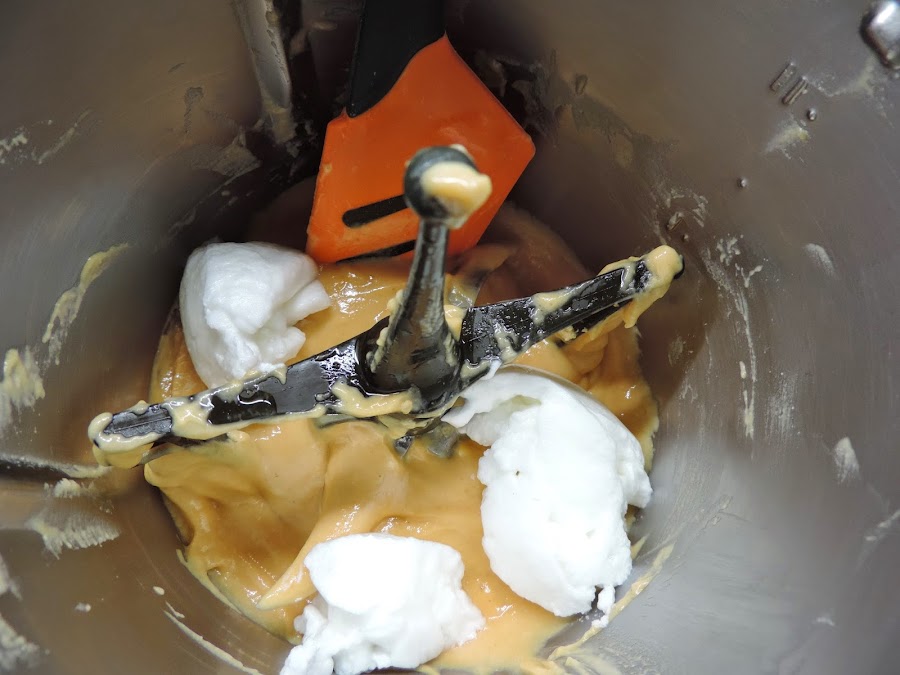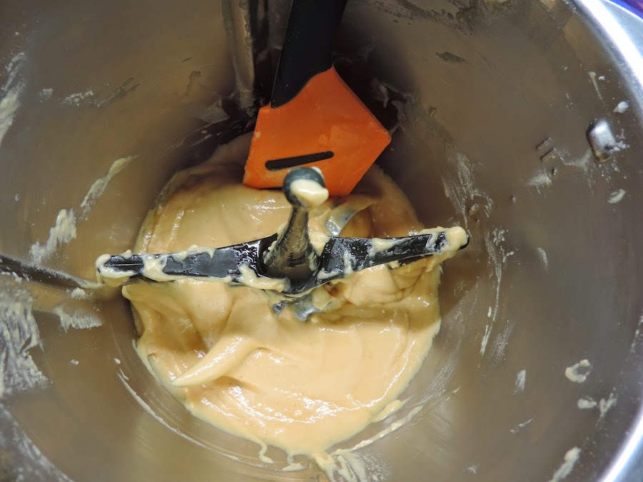 Programamos 5 minutos, velocidad 2 y vamos añadiendo por el vocal el zumo de mandarina, las yemas de huevo una a una hasta que estén integradas.