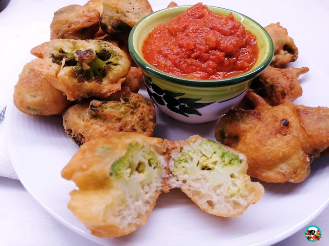 2.- Una vez que la masa este reposada, bañamos cada ramillete de brócoli en la masa. Freímos en abundate aceite caliente hasta que estén dorados por fuera. Una vez estén bien fritos los escurrimos sobre papel absorbente de cocina. Servimos los buñuelos de brócolis con salsa de tomate natural.