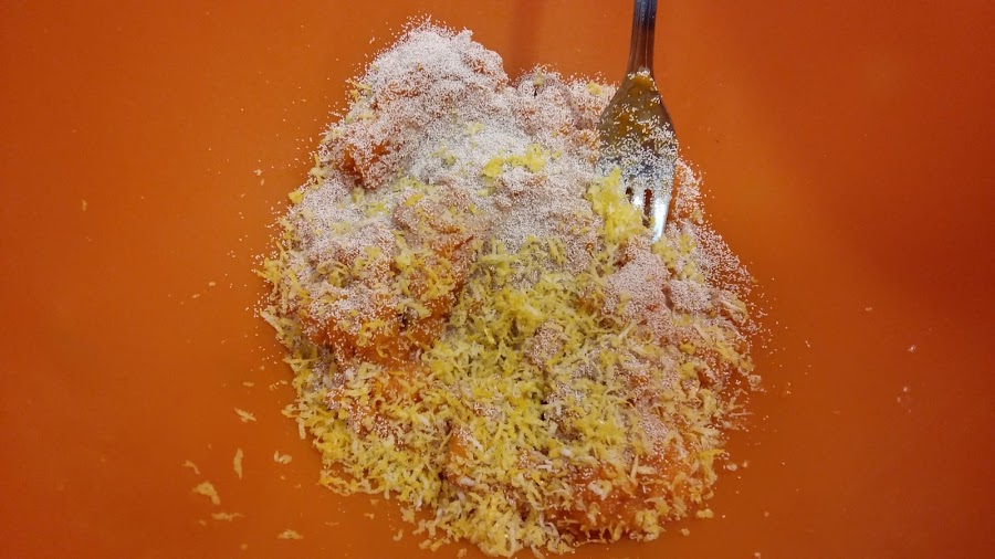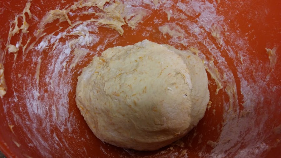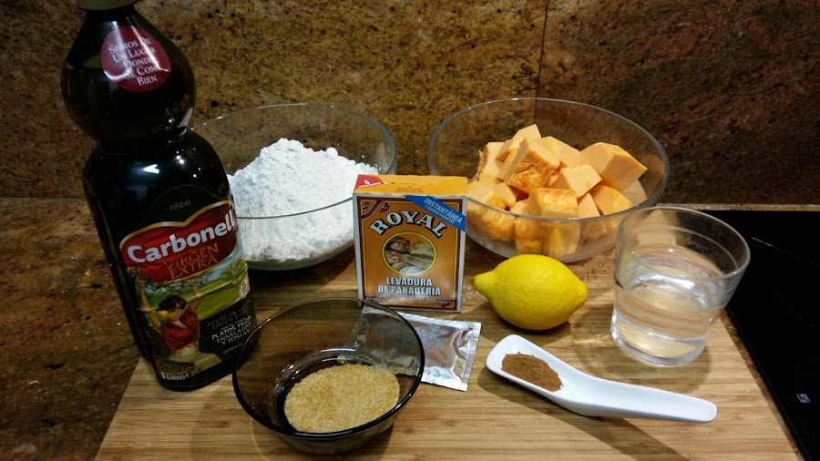 500 gr de calabaza pelada y sin pepitas, 400 gr de harina de trigo, 25 gr de levadura fresca o 1 sobre de levadura de panadería, ralladura de 1 limón aceite de oliva o girasol, 1/2 vaso de agua tibia, azúcar blanco o moreno y canela en polvo (opcional)