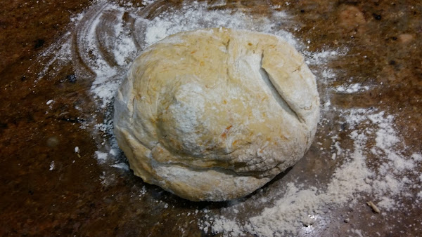 Una vez doblado el volumen, la ponemos en la encimera con un poco de harina y amasamos un par de minutos más.