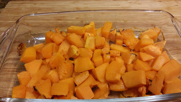 Pre-calentamos el horno a 180º. Cortaos la calabaza en trozos pequeños y la asamos durante 30 minutos