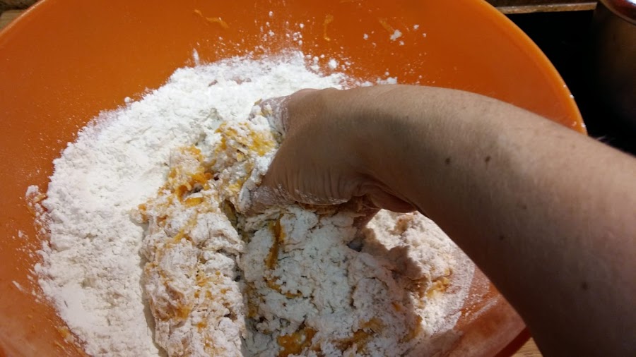 Iremos añadiendo la harina poco a poco y removiendo con las manos. Cuando esté toda la harina mezclada amaremos durante 10 minutos.