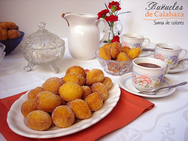 La cuestión es que hoy traigo mi propia versión de buñuelos de calabaza ideada a partir de la receta de que prepara mi abuela. Como ella hace las cosas a ojo y no mide los ingredientes, he tenido que reajustar cantidades hasta dar con unas proporciones adecuadas. Ha sido divertido aunque un poco lioso porque he tenido que adivinar las cantidades para poder hacer la foto de los ingredientes y luego comprobar que eran correctas.