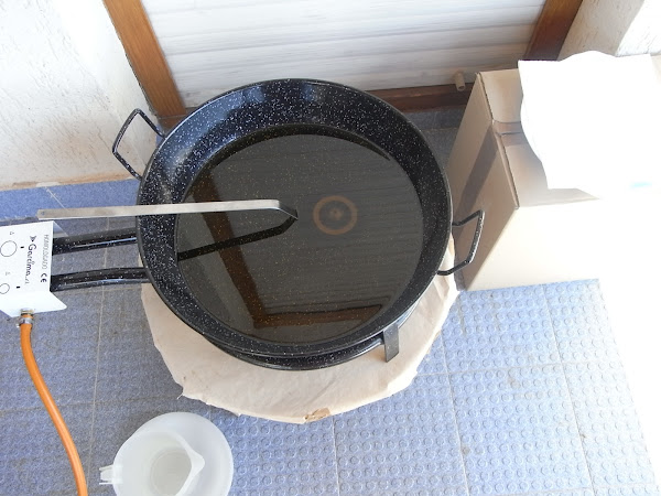 Se pone una sartén grande a fuego vivo y bastante aceite como 2 litros o más, se mete la buñolera dentro para que esté caliente a la hora de usarla y esperamos a que el aceite se caliente.