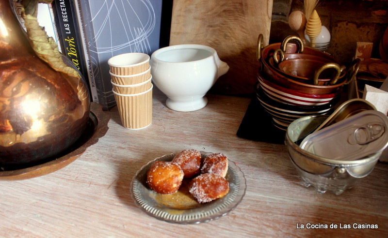 En un cazo calientas el aceite, introduces una masita ayudandote de dos cucharas o una manga pastelera, se darán la vuelta solos, si no lo hacen ayúdales un poco. Retiras a un plato con papel de cocina para que absorverá el exceso de grasa y recortas los piquinos de fritura sobrantes. Rebozas cada uno de ellos en un plato que has preparado con azúcar.
