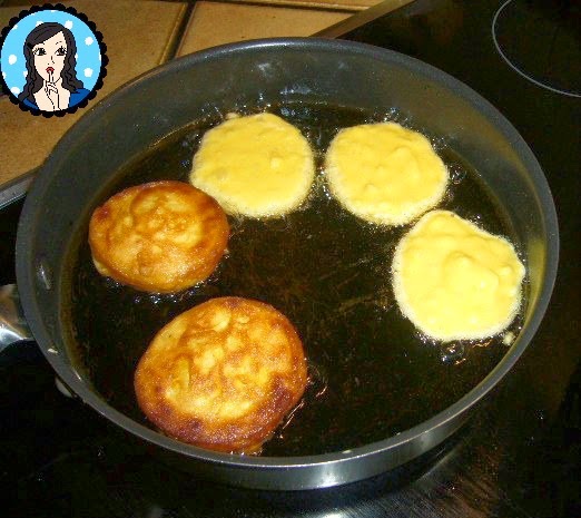 Prepara una sartén con aceite para freír; cuando esté caliente, con una cuchara sopera coge la masa con trozos de manzanas y lo fríes. Vamos observando cuando esté hecho, aproximadamente 1 minuto o 2; lo volteamos y esperamos que se haga por el otro lado.