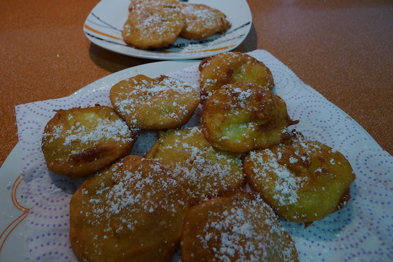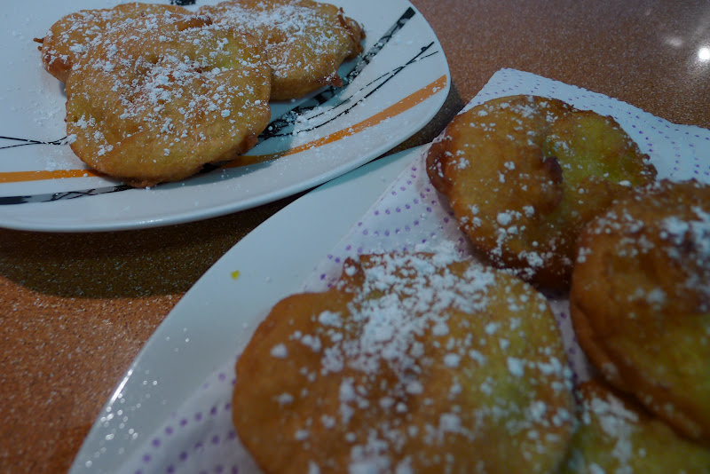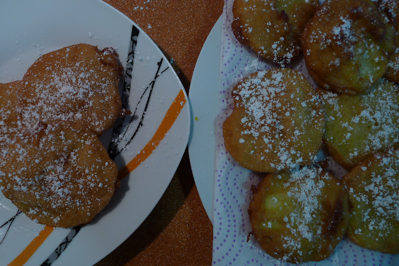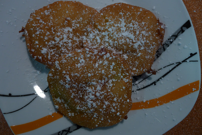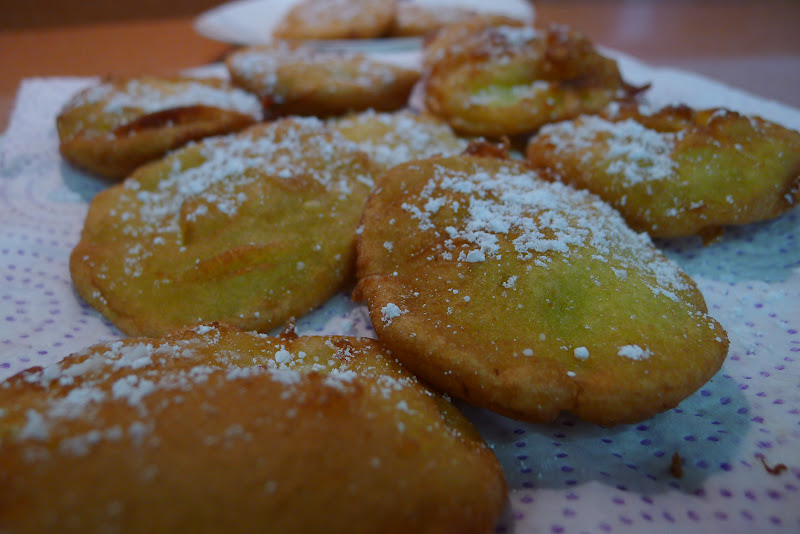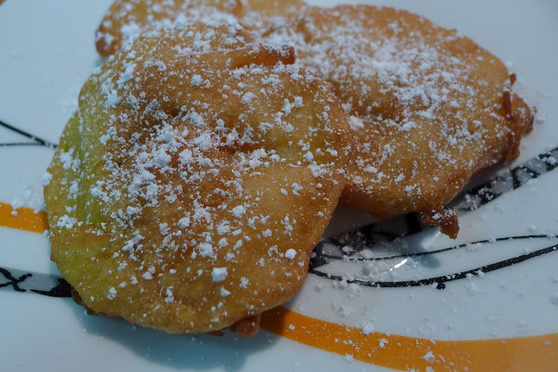 Ahora,vamos pasando las rodajas de manzana por la masa y las freimos en abundante aceite bien caliente durante 1 minuto aprox vuelta y vuelta.Asi con todas,las vamos sacando y poniendo sobre papel de cocina para absorver el exceso de aceite.Finalmente,espolvoreamos con azucar glass y..a disfrutarrr!!