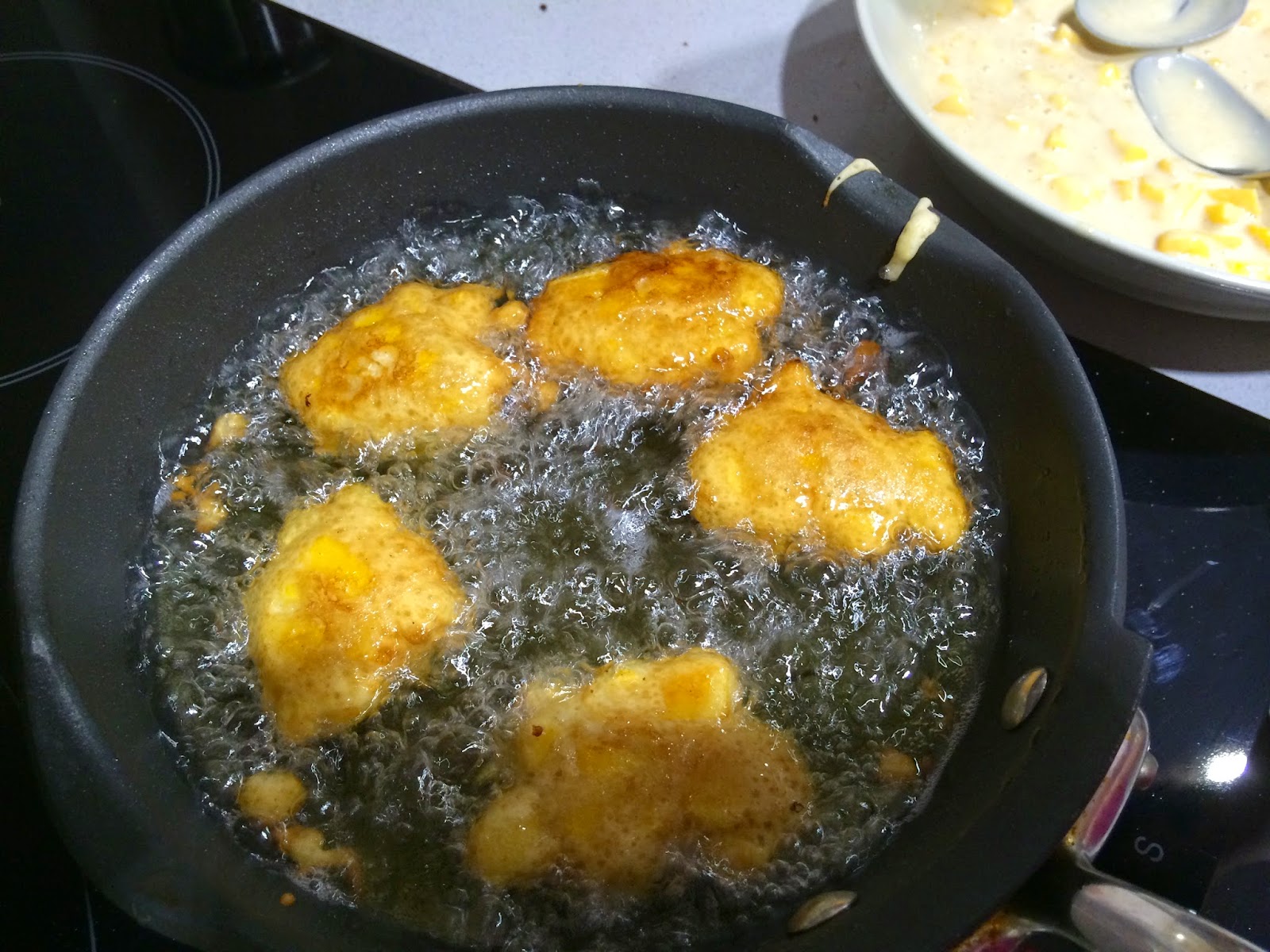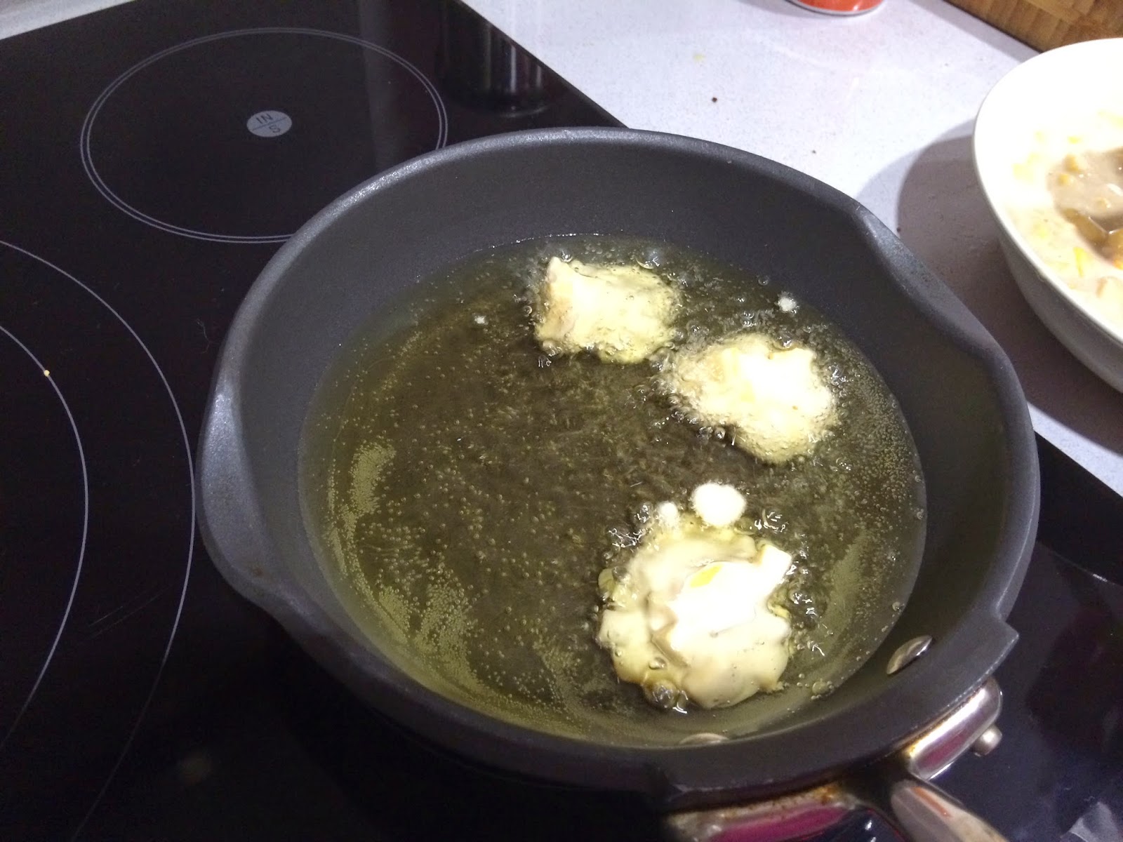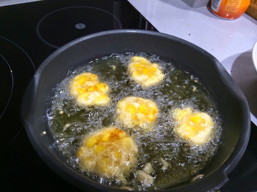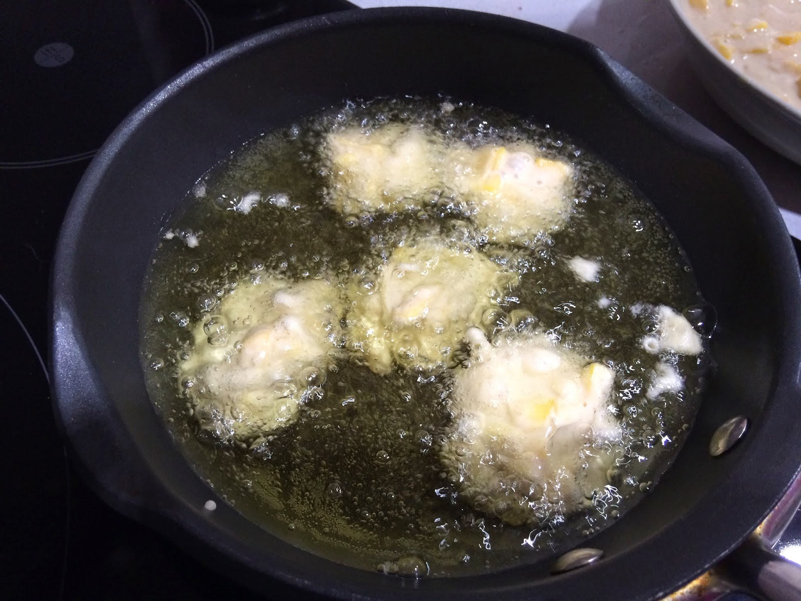 7. Calentamos en una sartén el aceite de girasol. Es importante que este caliente, pero no que arda, ya que tostaría demasiado rápido los buñuelos y quedarían crudos por dentro. Con dos cucharas soperas vamos vertiendo porciones de masa en la sartén. Freímos durante 1 minuto por cada lado, hasta que tome un color doradito.