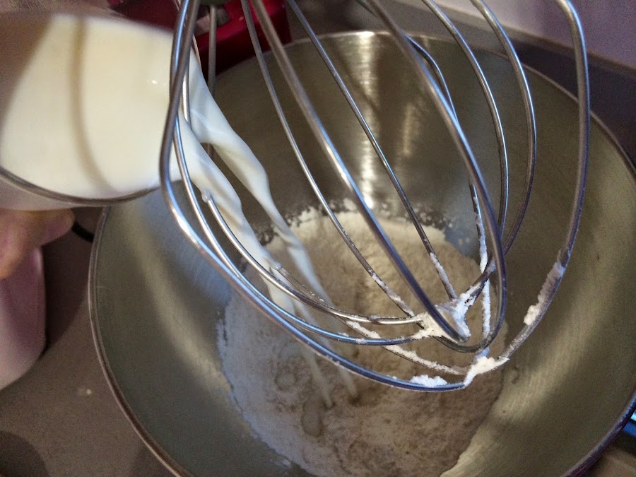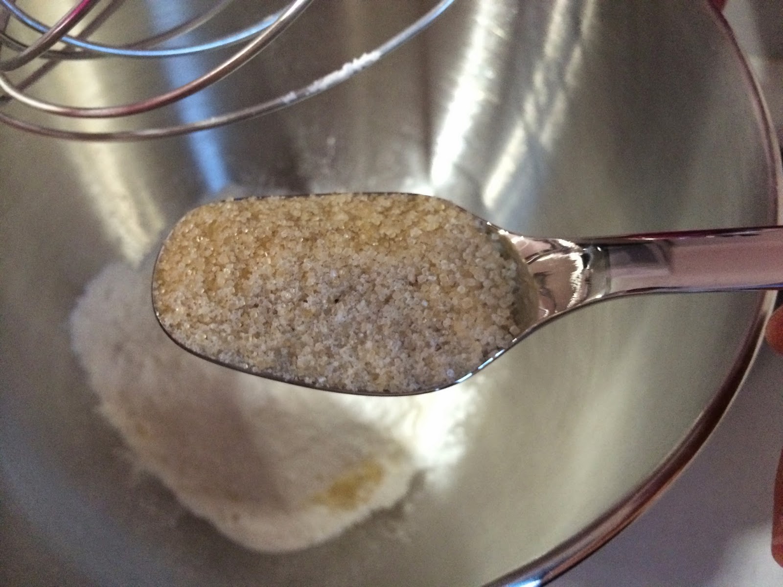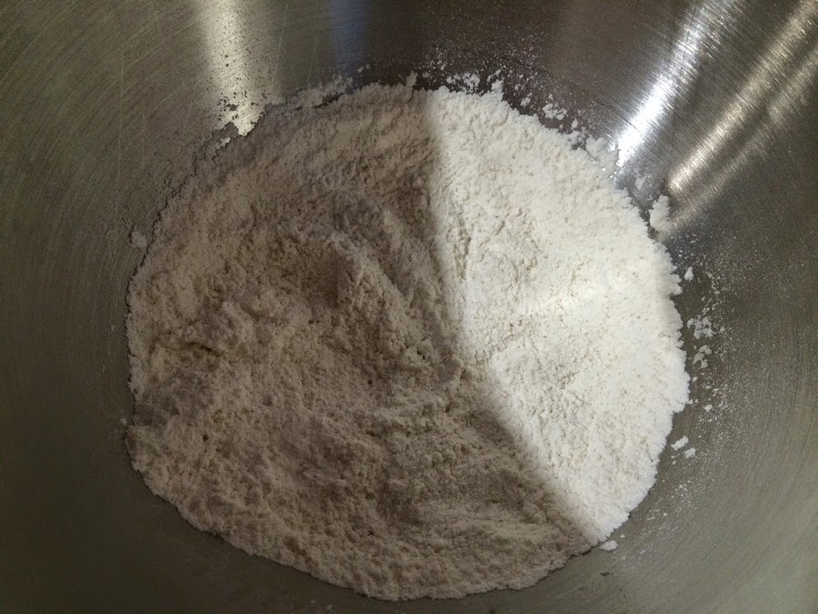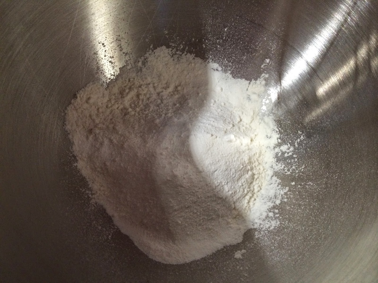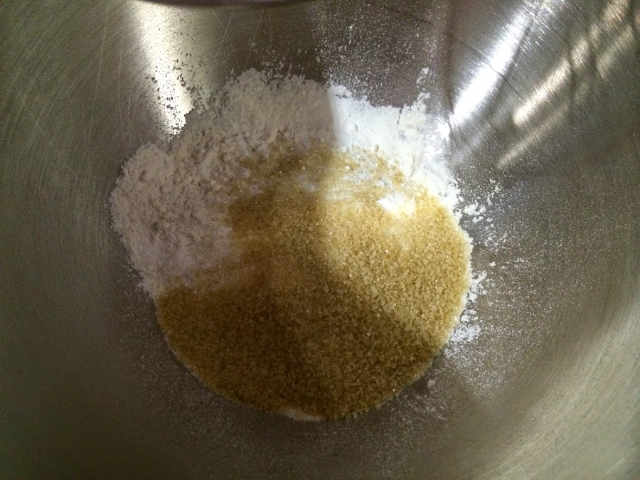 1. Ponemos en el bol de KA la harina de trigo. Añadimos el sobre de levadura royal y el azúcar de caña. Mezclamos bien los 3 ingredientes.