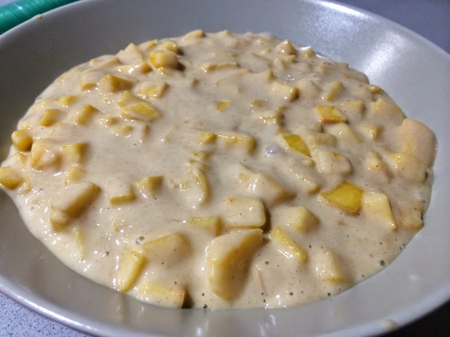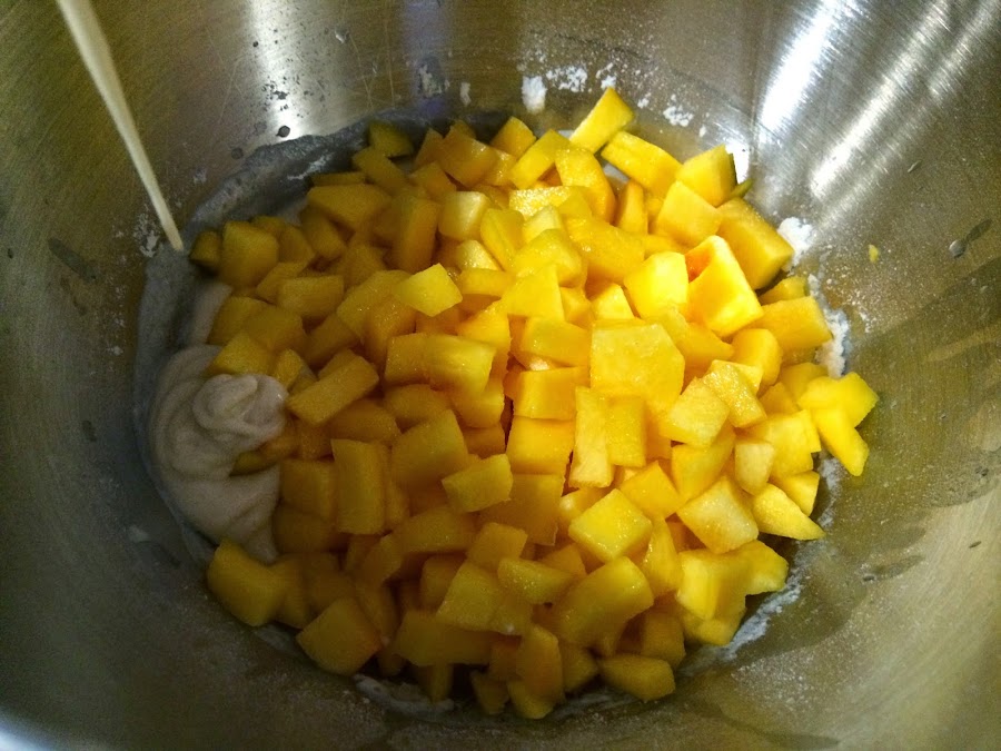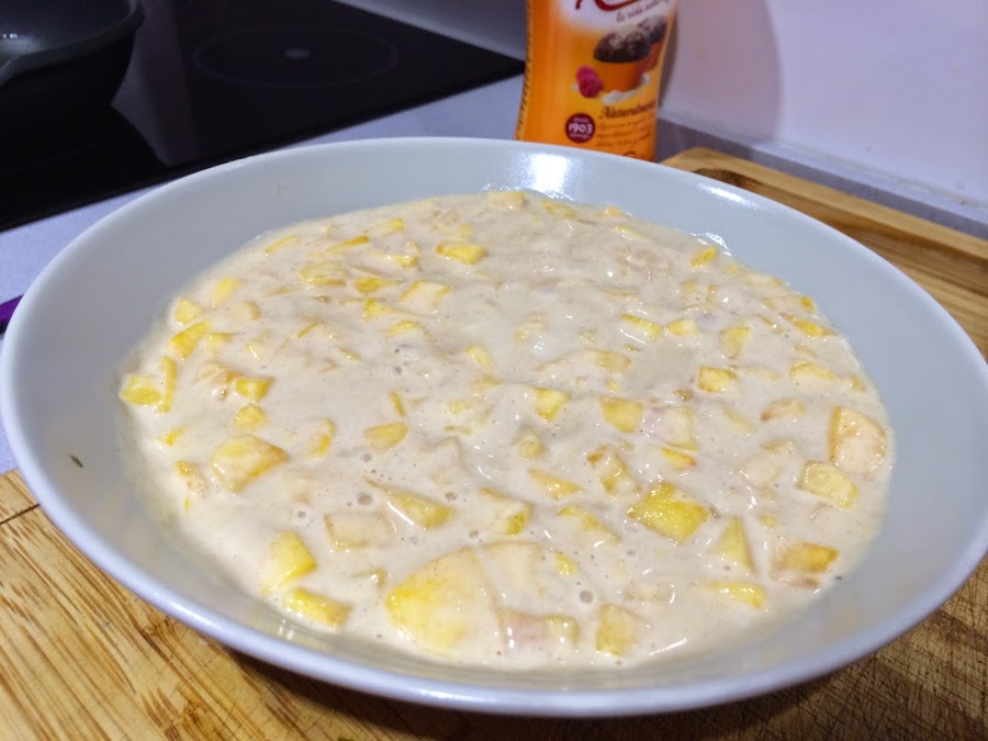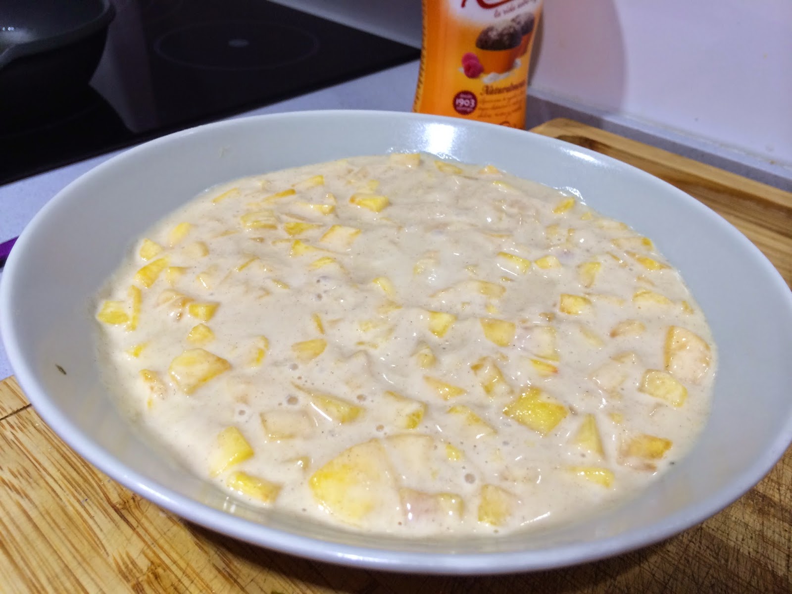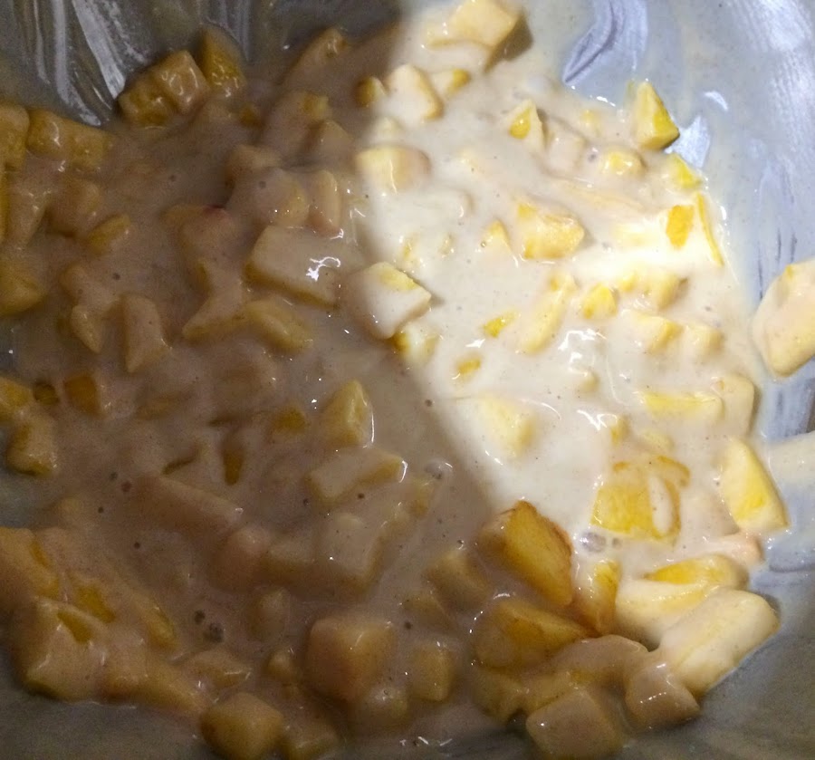 4. Añadimos los melocotones a la masa y mezclamos bien. Ponemos una pizquita de canela e integramos por completo.