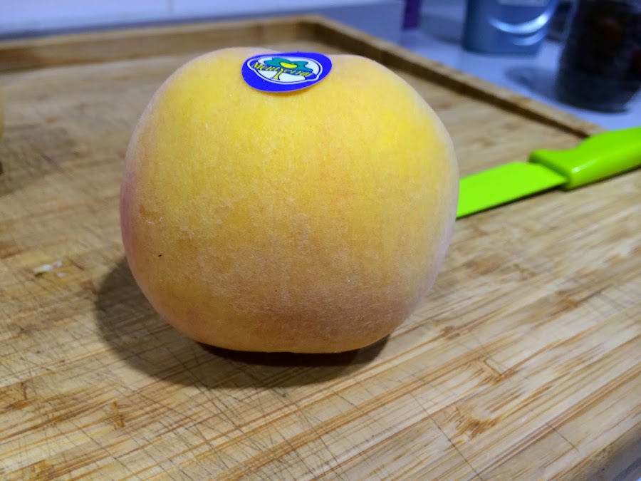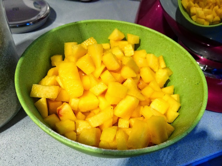 3. Pelamos los dos melocotones y los cortamos en trocitos pequeños, cuanto mas pequeños mejor quedará el resultado.