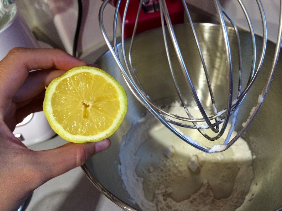 2. Añadimos los 80ml de leche y el zumo de medio limón. Mezclamos bien hasta integrar por completo todos los ingredientes. Nos debe quedar una masa de consistencia densa. Al añadir el melocotón ya le aportará la humedad que necesita.