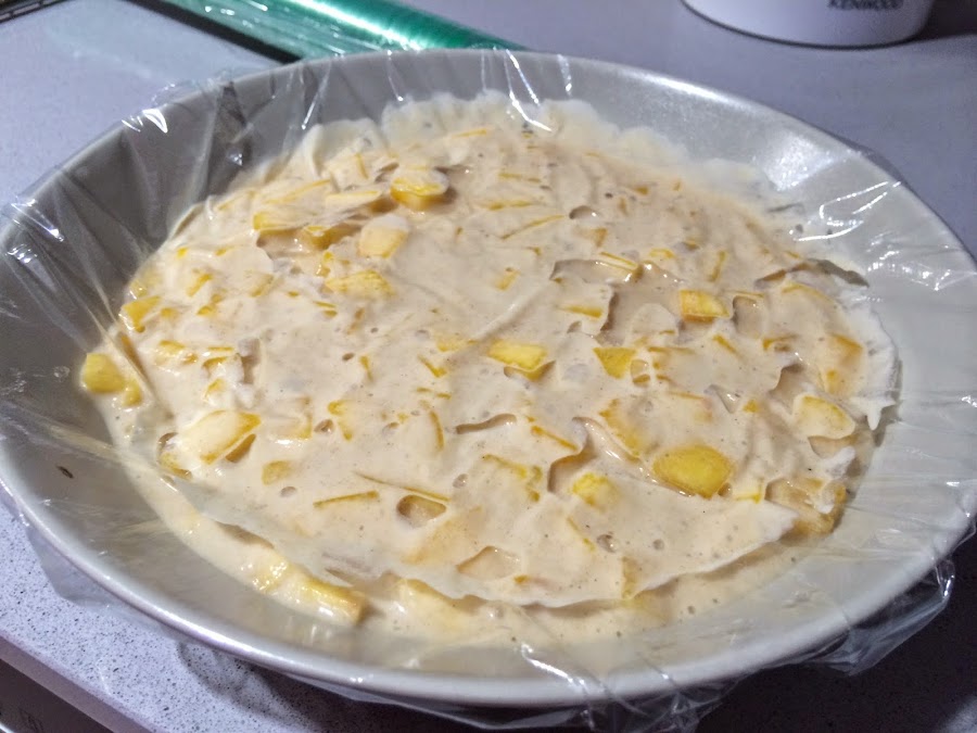 5. Ponemos la masa en un plato hondo y cubrimos con papel film, tocando la superficie para que no se reseque. Llevamos a la nevera mínimo una hora, si puede ser un poquito mas mejor.