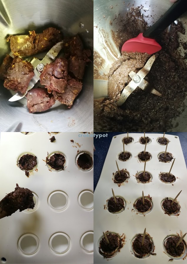 Una vez triturada, se pasa la masa de morcilla a estos moldes de silicona para poder congelar; pero si no tenéis, según indica el chef, se pasan a la manga pastelera y hacer bolas con la manga sobre papel sulfurizado y pasar al congelador.