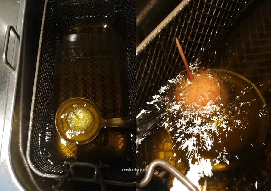 Para freír los buñuelos, los desmoldamos, se pasan por la tempura y los freímos en aceite de oliva AOVE, en una sartén honda o en la freidora, si lo haces en la freidora, pon un cazo metálico dentro para que no pierda la forma. Una vez dorado, dejamos sobre papel absorbente .