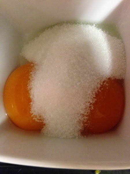 Batiremos dos yemas de huevo con el azúcar y la fécula de maíz.