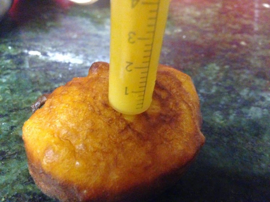 Rellenaremos los buñuelos con la crema, se puede hacer con una jeringa.