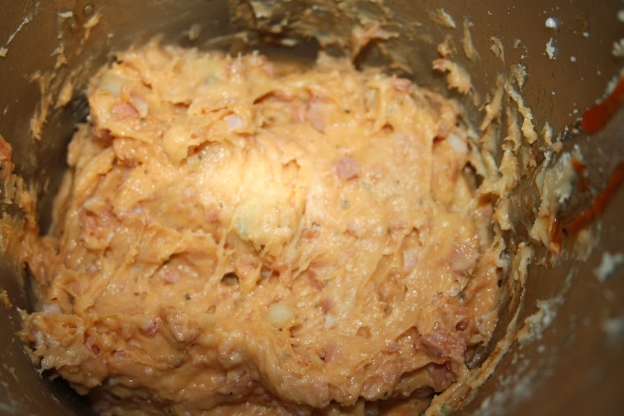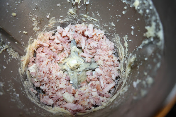Colocamos El bacon, las salchichas, el queso y las especias y trituramos a vel 4 10 seg. Reservamos.
