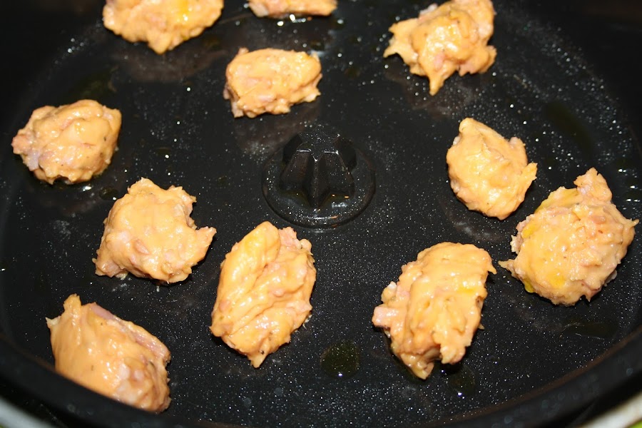 Ayudandonos de dos cucharitas, vamos volcando bolitas de masa en la cubeta, con cuidado de que queden separadas entre si.