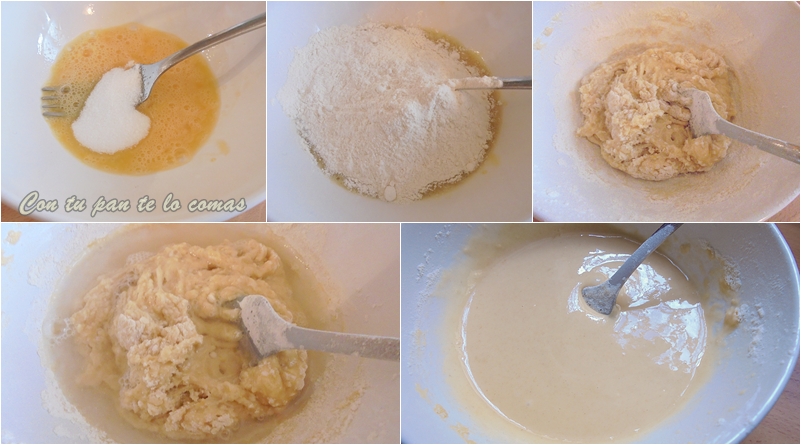 2. Mezclar con la harina bizcochona y remover con el tenedor aunque para obtener la masa adecuada para los buñuelos deberás añadir un poquito de agua (a ojo) hasta que veas que queda parecida a la de la foto.